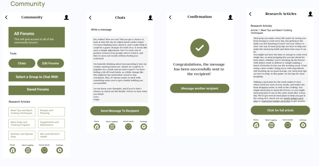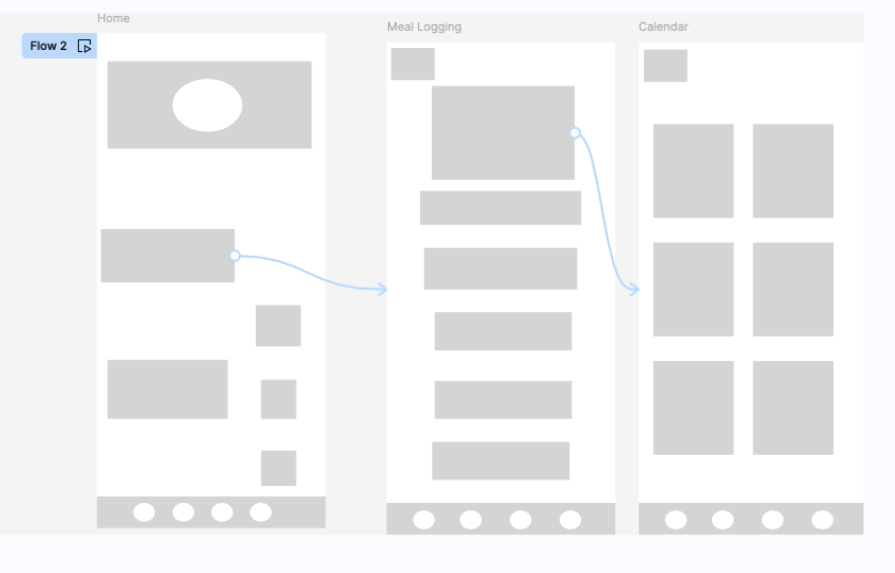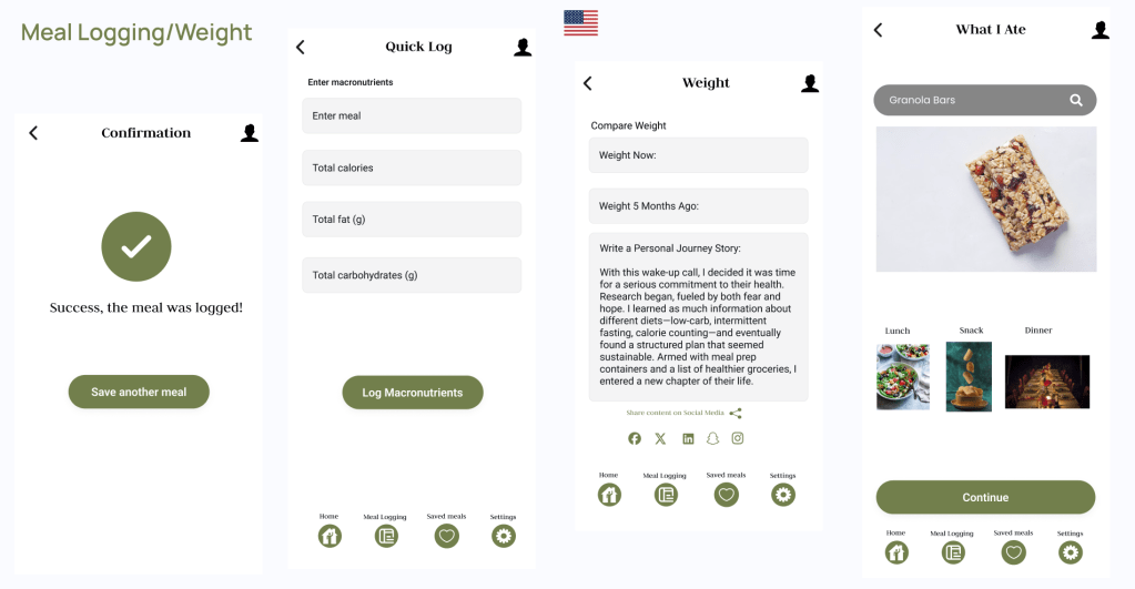 From the home page, users can click on the meal logging tab, and then situate themselves where a calendar wil be viewable. The meal logging page wil have the option to choose between breakfast, lunch, dinner, or dessert. The calendar page will serve as a place to save all of the information and look back to it after they choose a day to save their meal to.